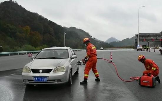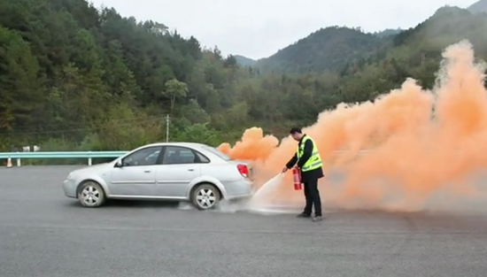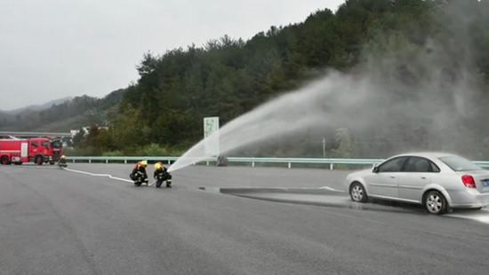 演练发生在紫云南高速收费站出口广场,模拟一辆小轿车在下收费站突然失控与进站客车发生碰撞导致倾倒,小轿车发生自燃,造成驾驶员受伤昏迷的事故。